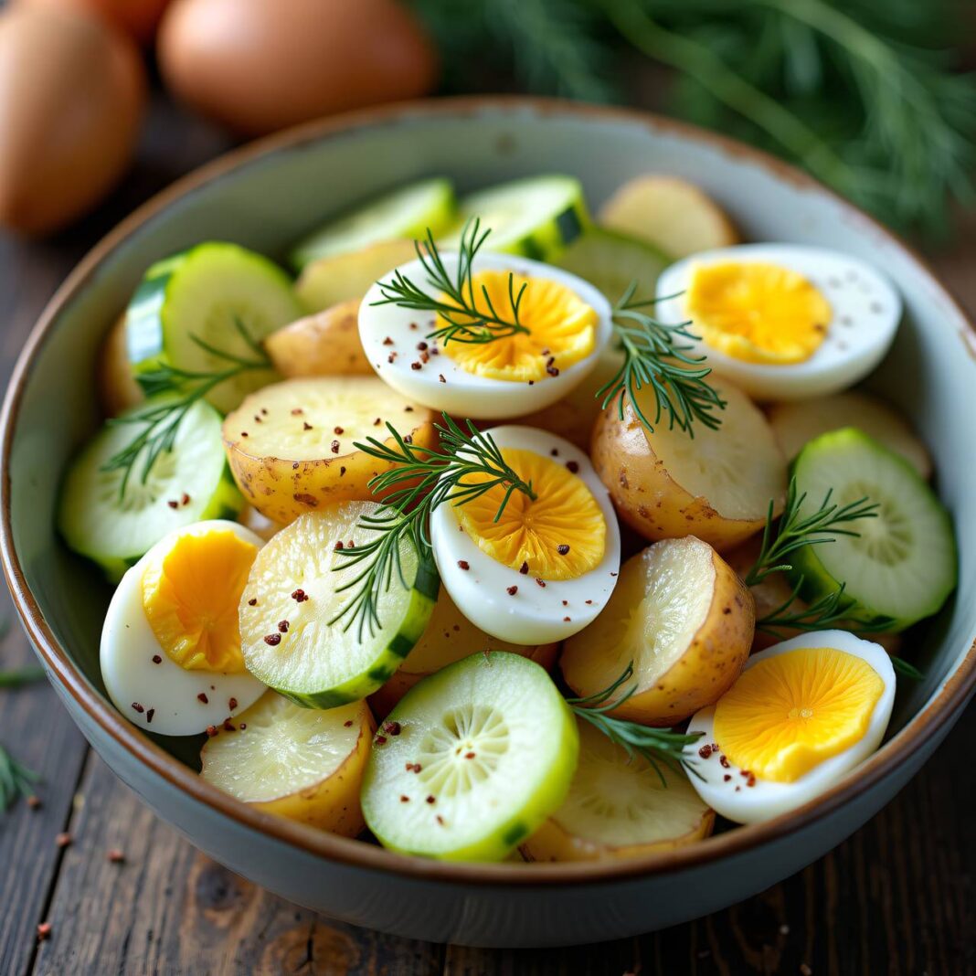 Ein erfrischender Kartoffelsalat mit Dill und Gurken, perfekt für warme Tage.