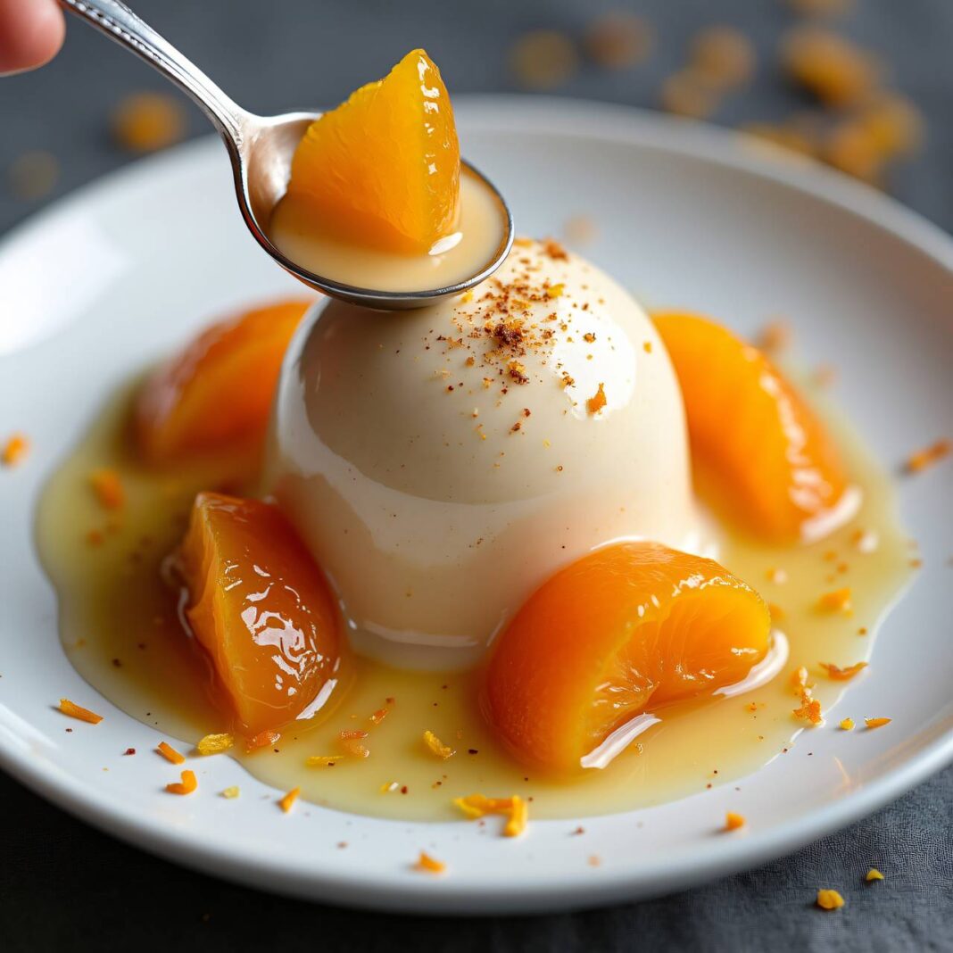 Ein erfrischendes und aromatisches Eis aus Kefir, Honig und Gewürzen, serviert mit einer köstlichen Orangensauce.