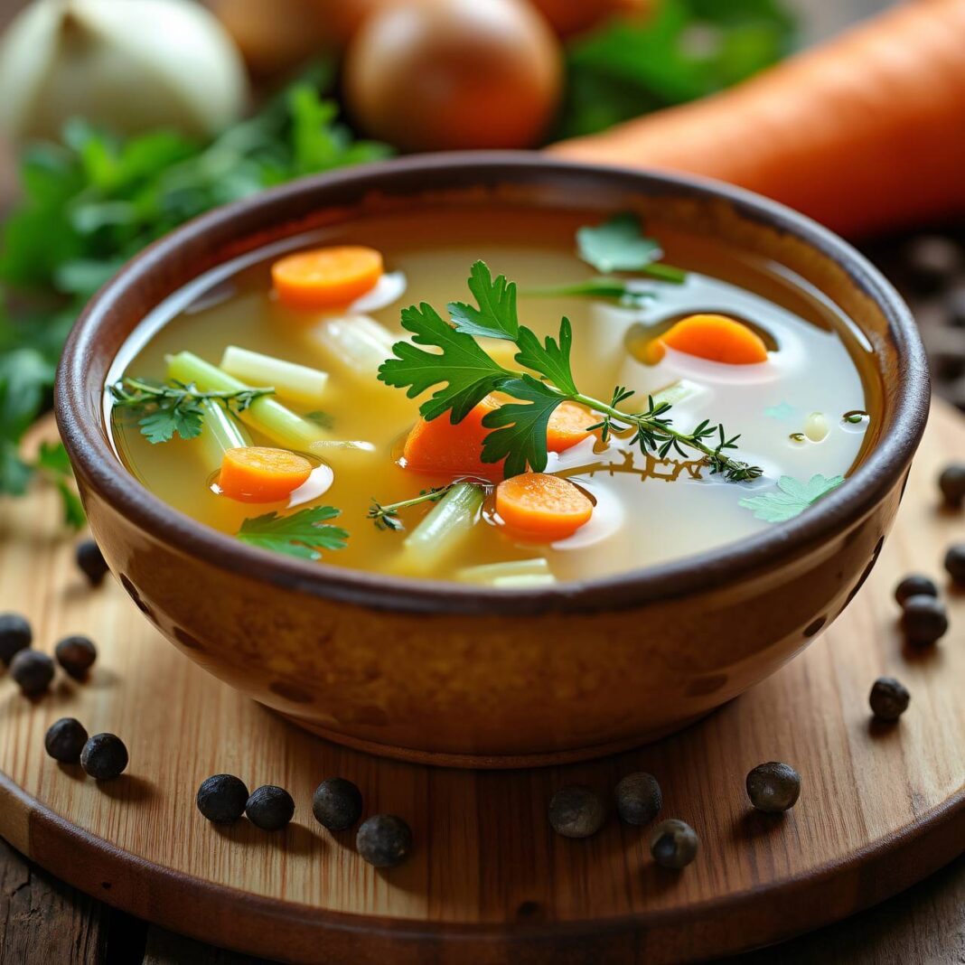 Eine aromatische klare Gemüsebrühe, die als Basis für Suppen oder Saucen verwendet werden kann.