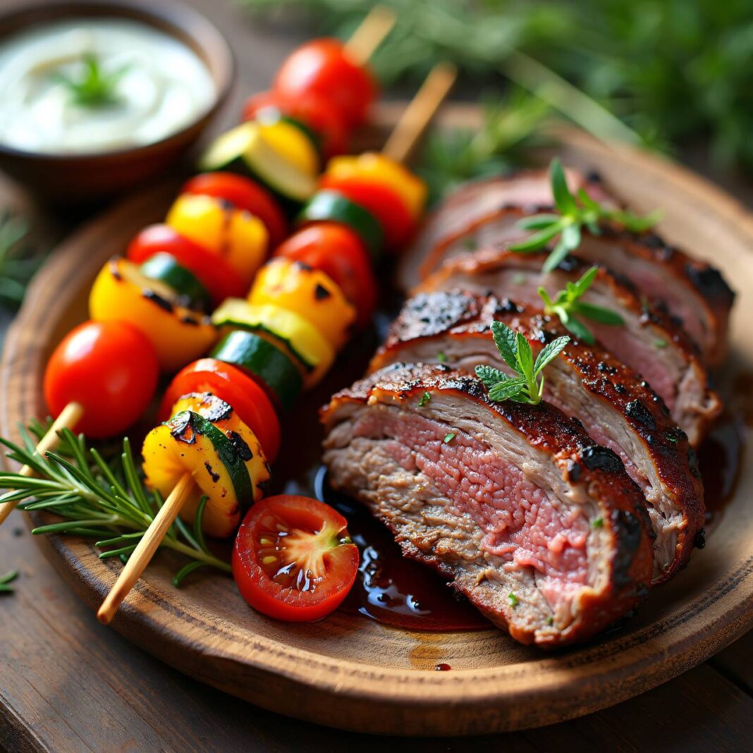 Leckeres Lammfleisch mariniert mit Knoblauch und Kräutern, serviert mit gegrilltem Gemüse und Tzatziki.