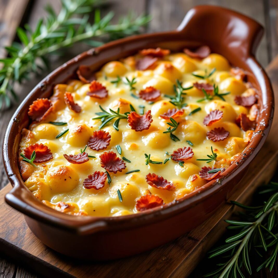 Ein köstliches Knöpfli-Gratin mit Speck und Maroni, perfekt für ein herzhaftes Abendessen.