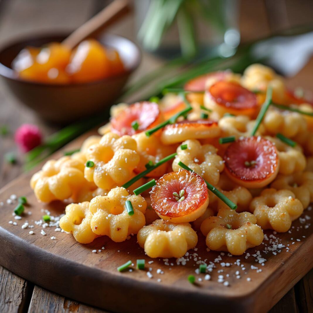 Anrichten: Das Apfelmus in Schälchen anrichten. Die Knöpfli und die Wurstblumen auf vorgewärmten Tellern anrichten und die Zwiebeln darübergeben.