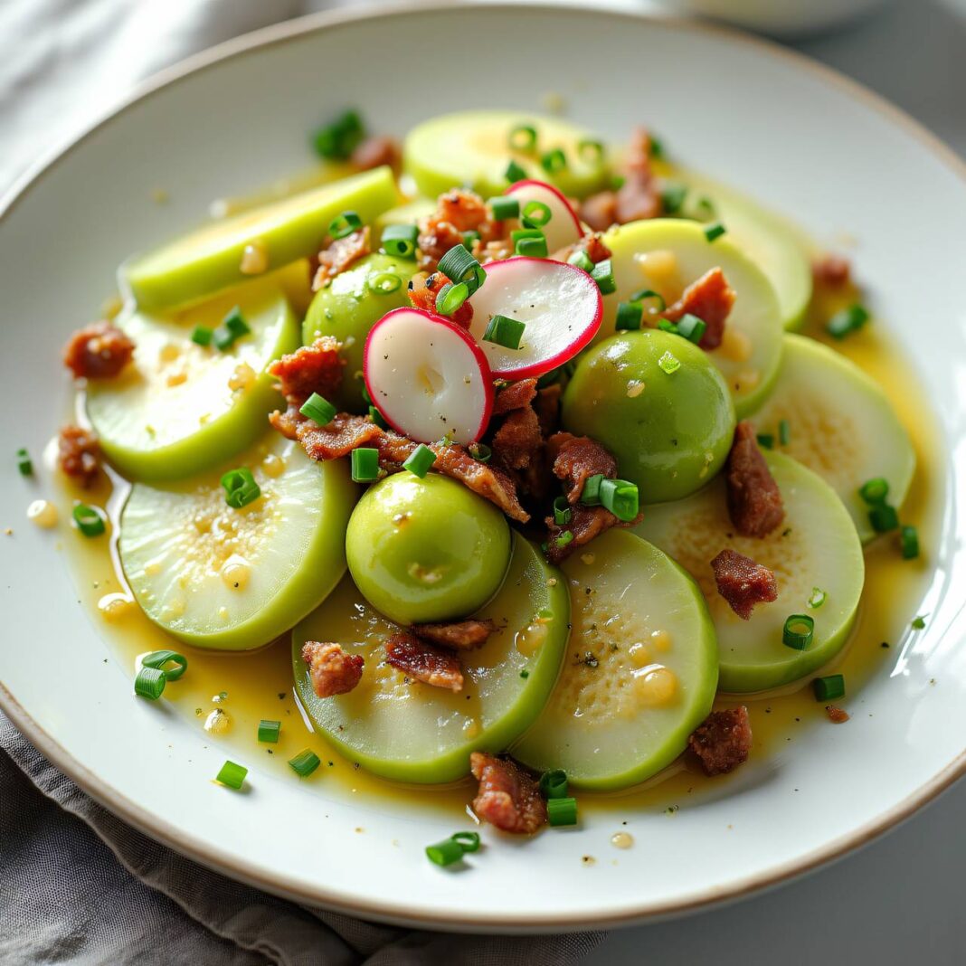Ein leckeres Rezept für Kohlrabischeiben, serviert mit einer herzhaften Vinaigrette und garniert mit hartgekochten Eiern und Schnittlauch.