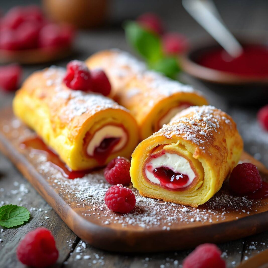 Leckere Rollen aus Omelette mit einer Füllung aus Frischkäse, Magertopfen und Himbeermarmelade.