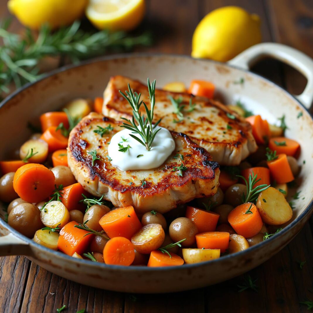 Ein köstliches Rezept für Schweinskoteletts mit einem aromatischen Zitronen-Kartoffel-Gemüse.