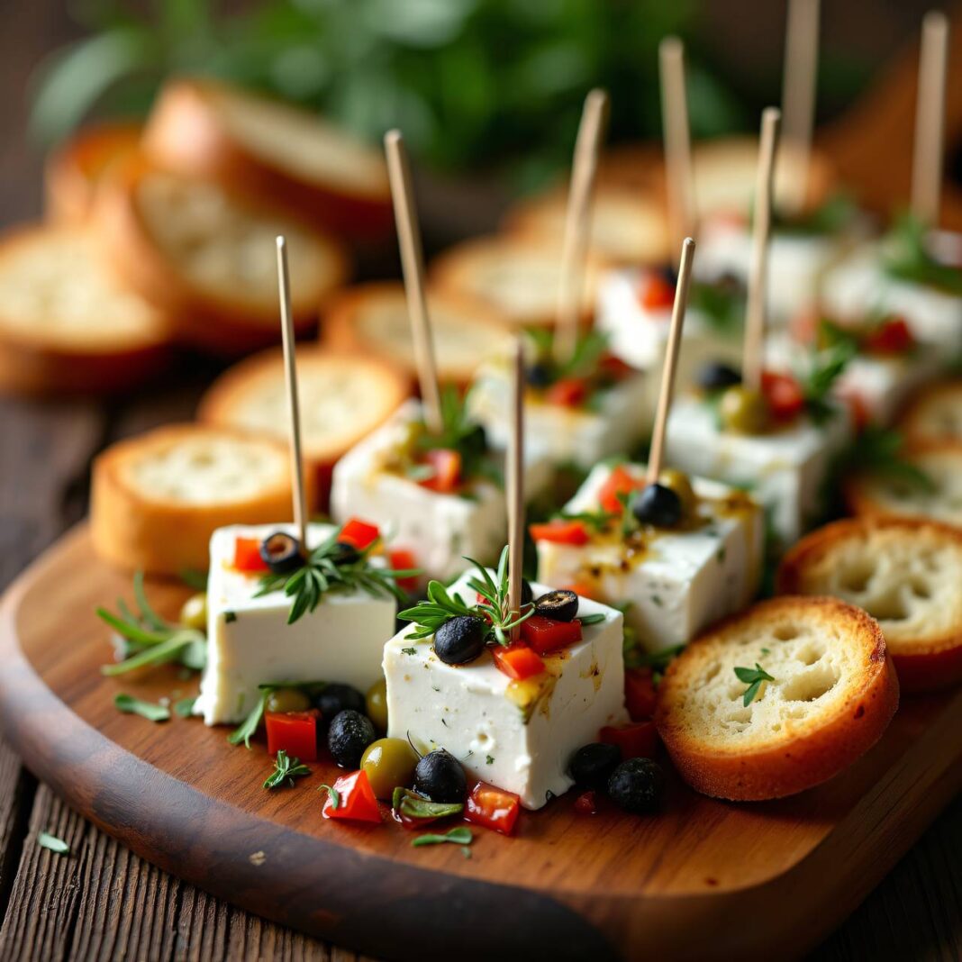 - Servieren: Den marinierten Frischkäse aus dem Gefäß nehmen und in Würfel schneiden oder brechen. Die Frischkäsewürfel auf Zahnstocher stecken und mit den getoasteten Baguettescheiben servieren.