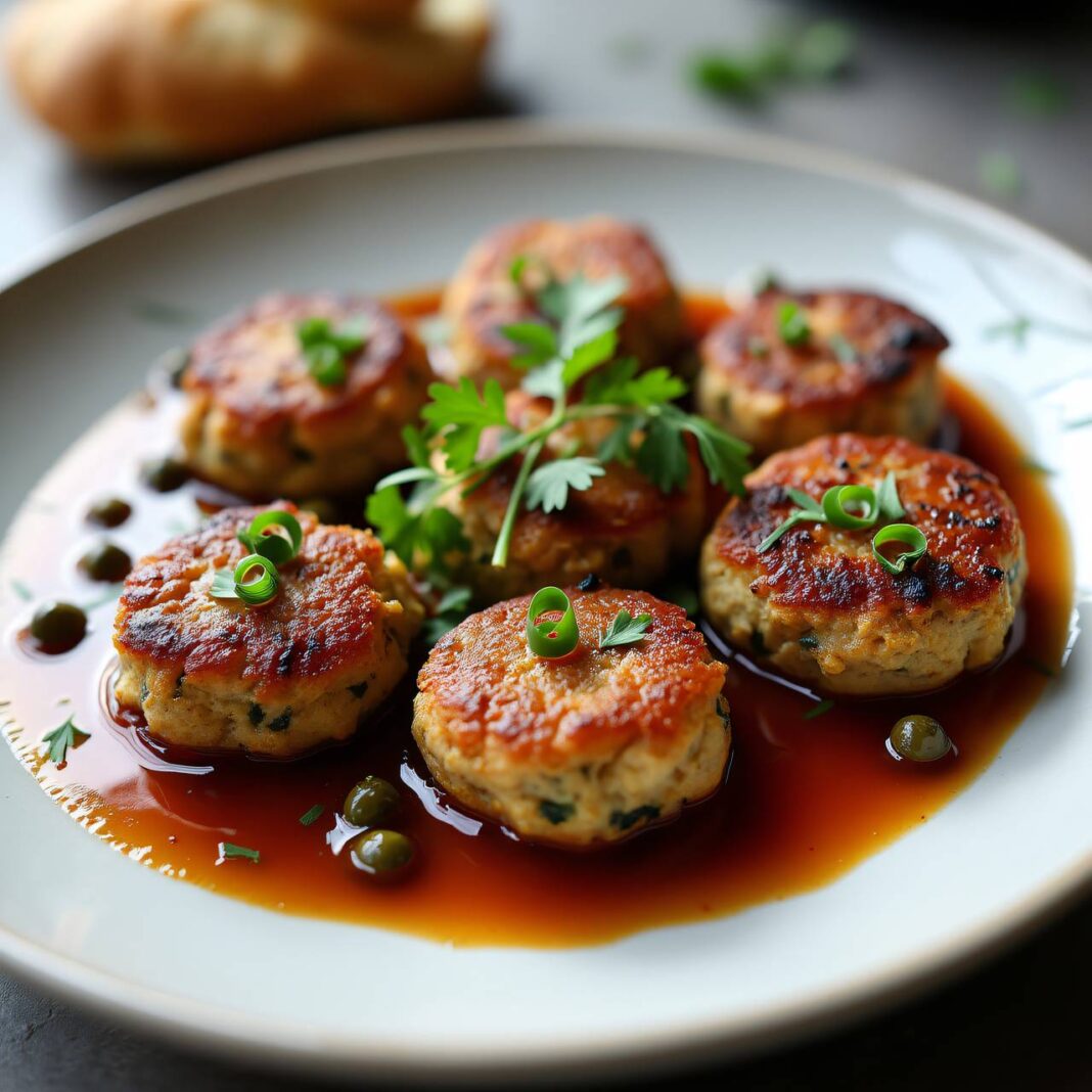 Leckere Fleischlaibchen mit Kapern und frischen Kräutern, serviert mit einer köstlichen Sauce.