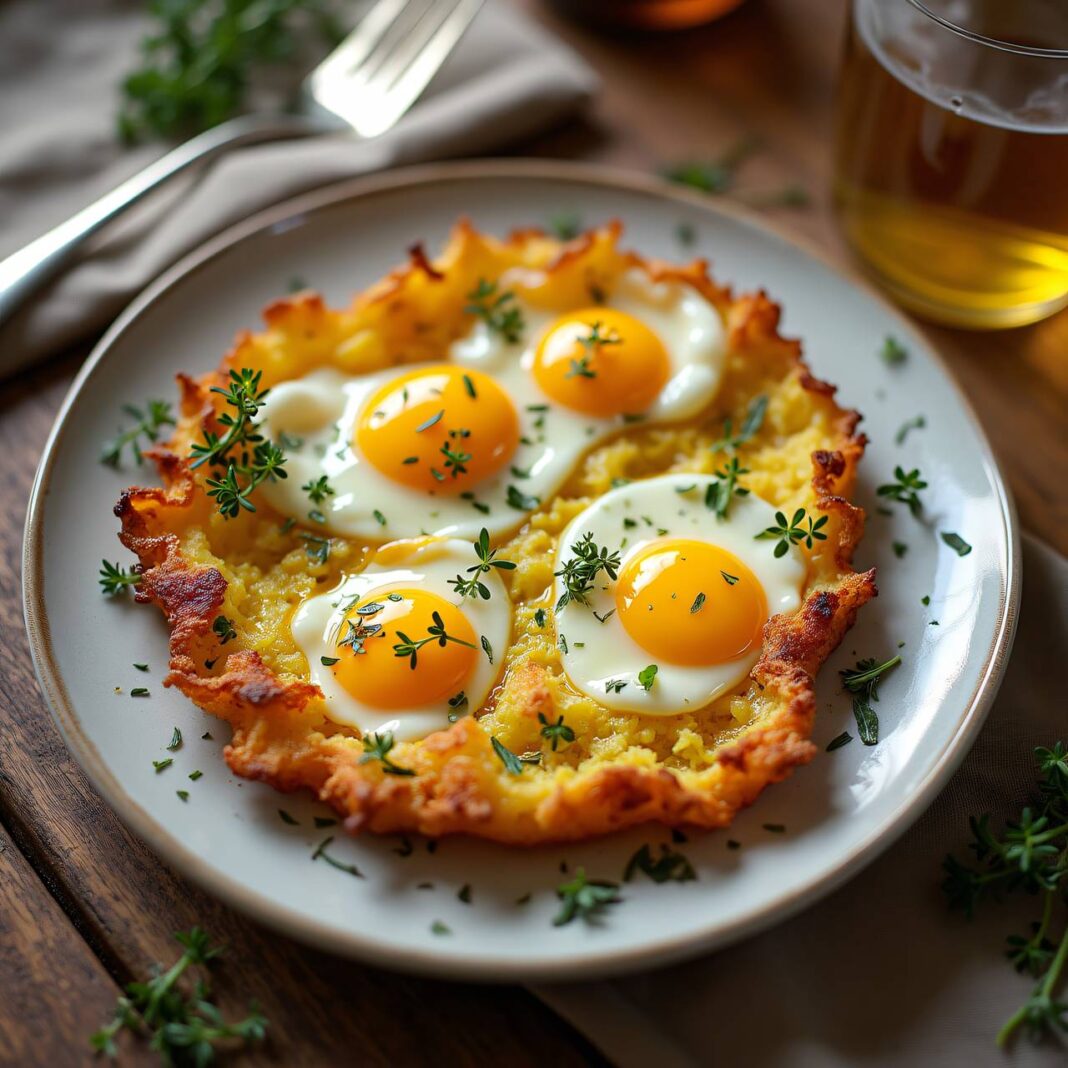 Ein köstliches Rezept für Kräuter-Rösti, garniert mit perfekt pochierten Eiern und frischen Kräutern.