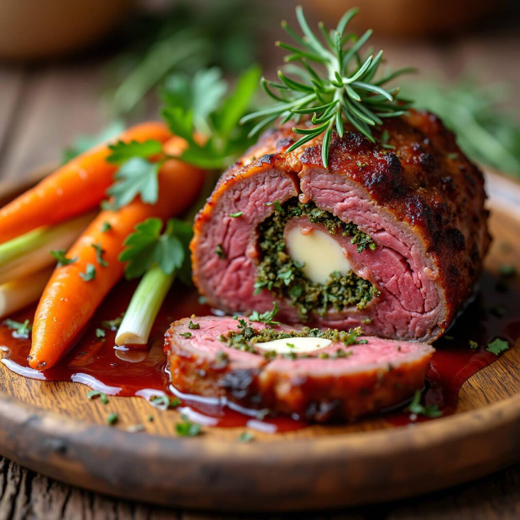 Ein saftiger Rindsbraten gefüllt mit frischen Kräutern und serviert mit einer köstlichen Sauce.