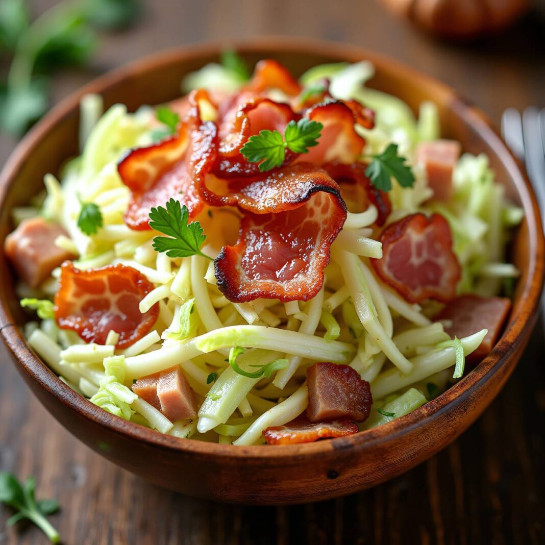 Ein leckerer Krautsalat mit knusprigem Speck, perfekt als Beilage oder Snack.