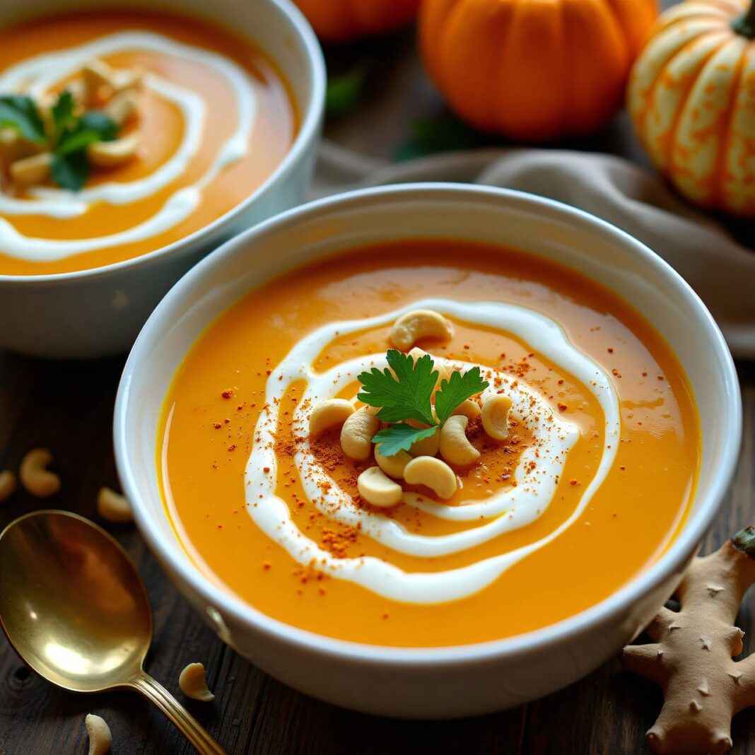 Eine cremige Kürbis-Ingwer-Suppe, verfeinert mit Curry-Cashews für den besonderen Geschmack.