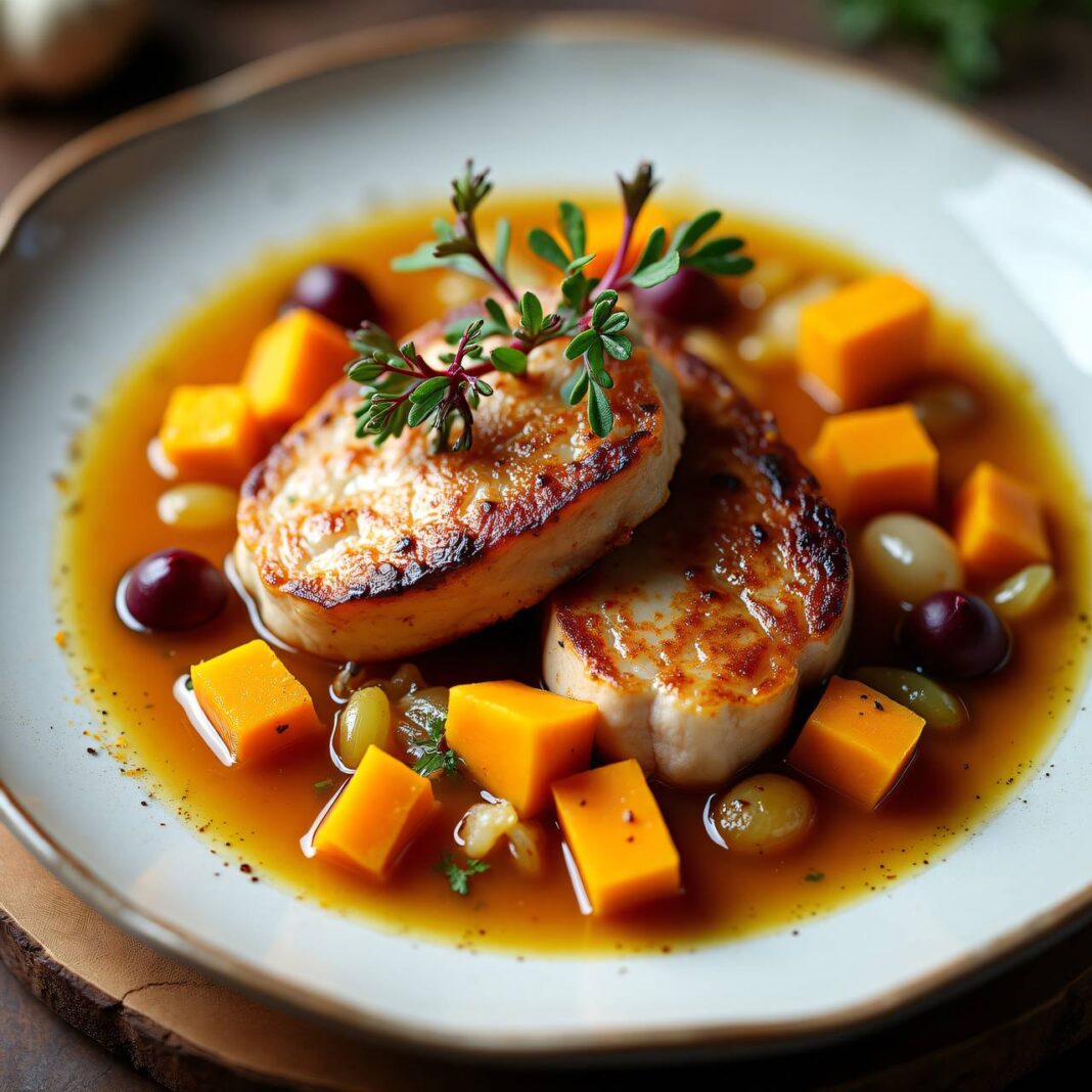 Ein herzhaftes Kürbis-Pot-au-feu mit zarten Kaninchenfilets, gewürzt mit aromatischen Gewürzen und serviert mit Rote Rübensprossen.