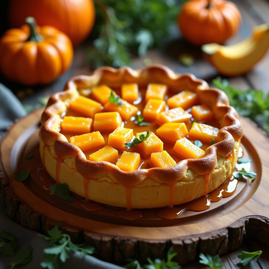 Ein köstlicher Kürbiskuchen mit würzigem Raclettekäse und einem knusprigen Teig.