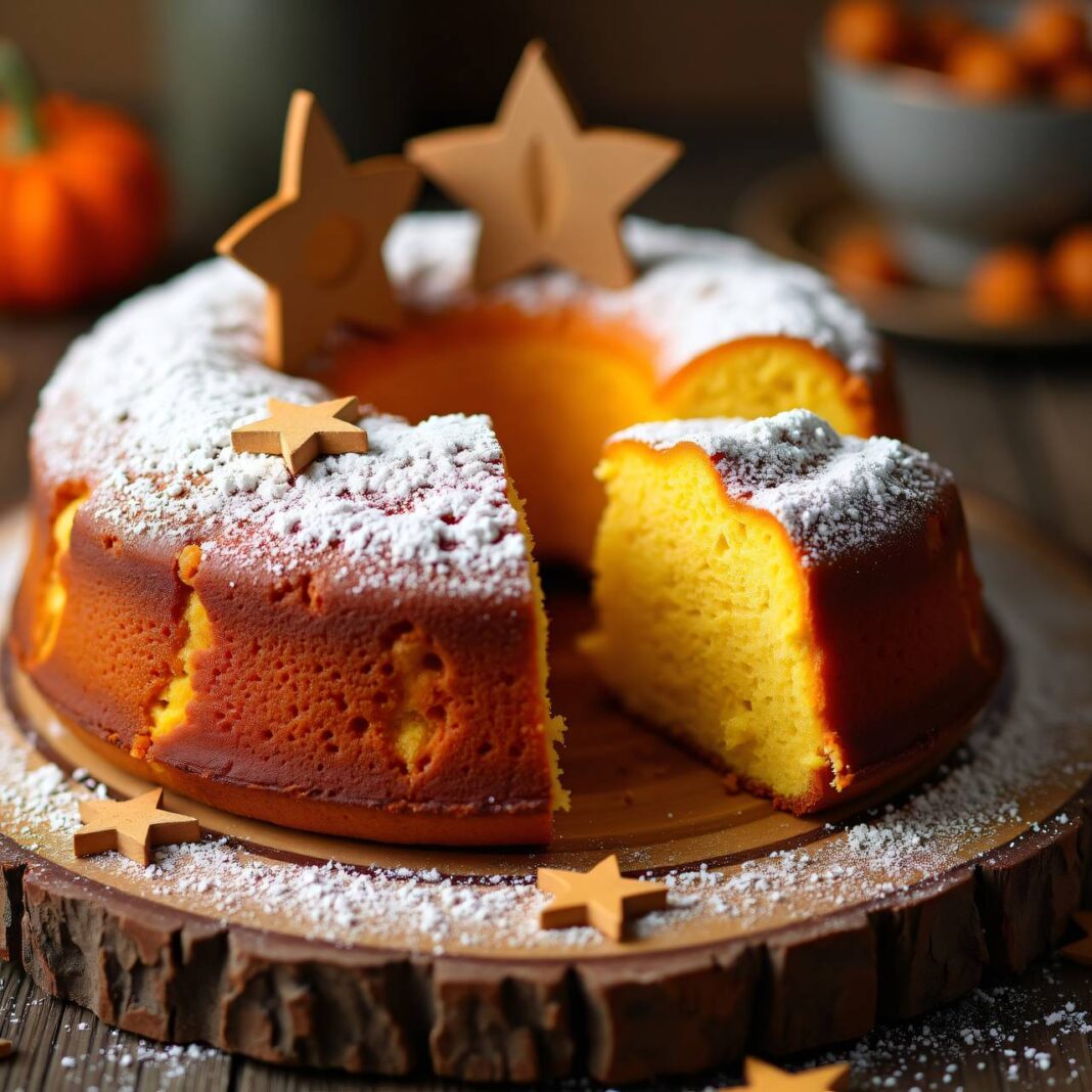 Servieren: Den Kürbis-Maiskuchen lauwarm oder ausgekühlt mit Kartonsternen belegen und mit Staubzucker bestäuben. Die Kartonsterne vorsichtig mit einer Messerspitze abheben.