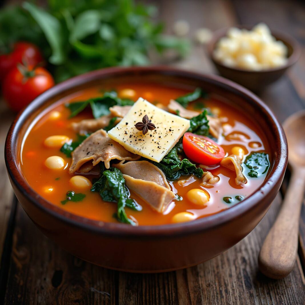 Eine herzhafte Kuttelsuppe mit aromatischem Bergkäse, perfekt für kalte Tage.