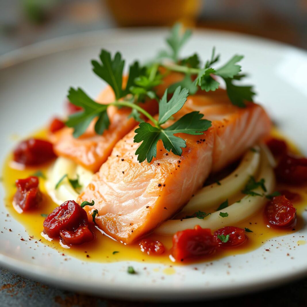Ein köstliches Gericht mit zarten Lachsforellenfilets, serviert mit Schwarzwurzeln und einer aromatischen Tomatenbutter.