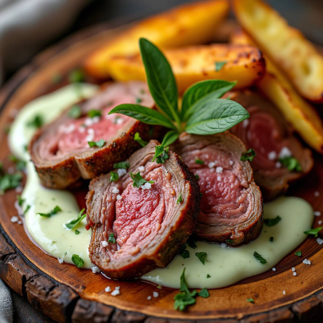 Ein köstliches Lammgigot, mariniert in Buttermilch und serviert mit einer feinen Bärlauch-Sauce und knusprigen Kartoffelschnitzen.
