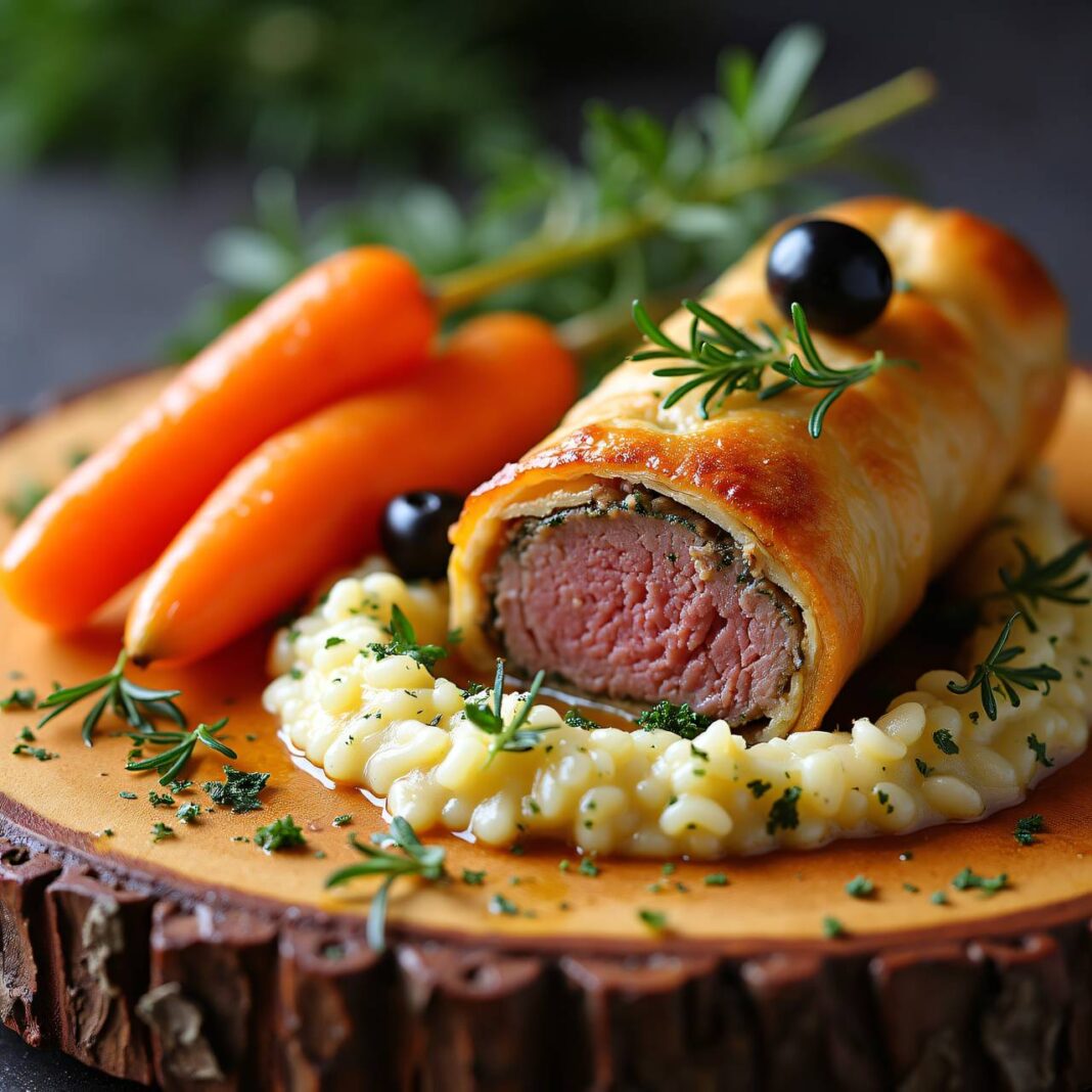 Zartes Lammrückenfilet umhüllt von knusprigem Strudelteig, serviert mit Rosmarin-Risotto und Karotten-Gemüse.