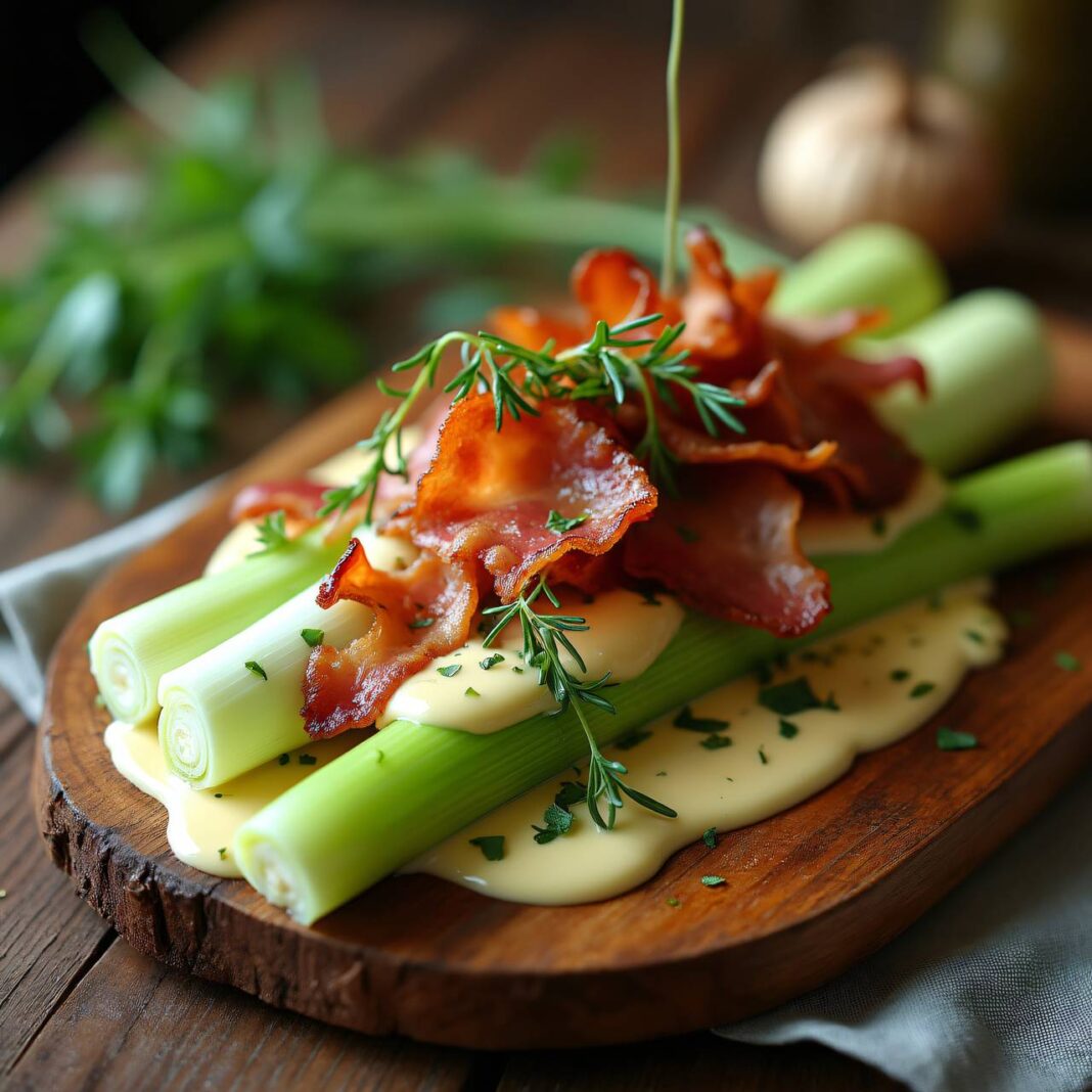 Ein köstlicher lauwarmer Lauchsalat serviert mit einer cremigen Estragon-Sahnesauce und knusprigem Rohschinken.
