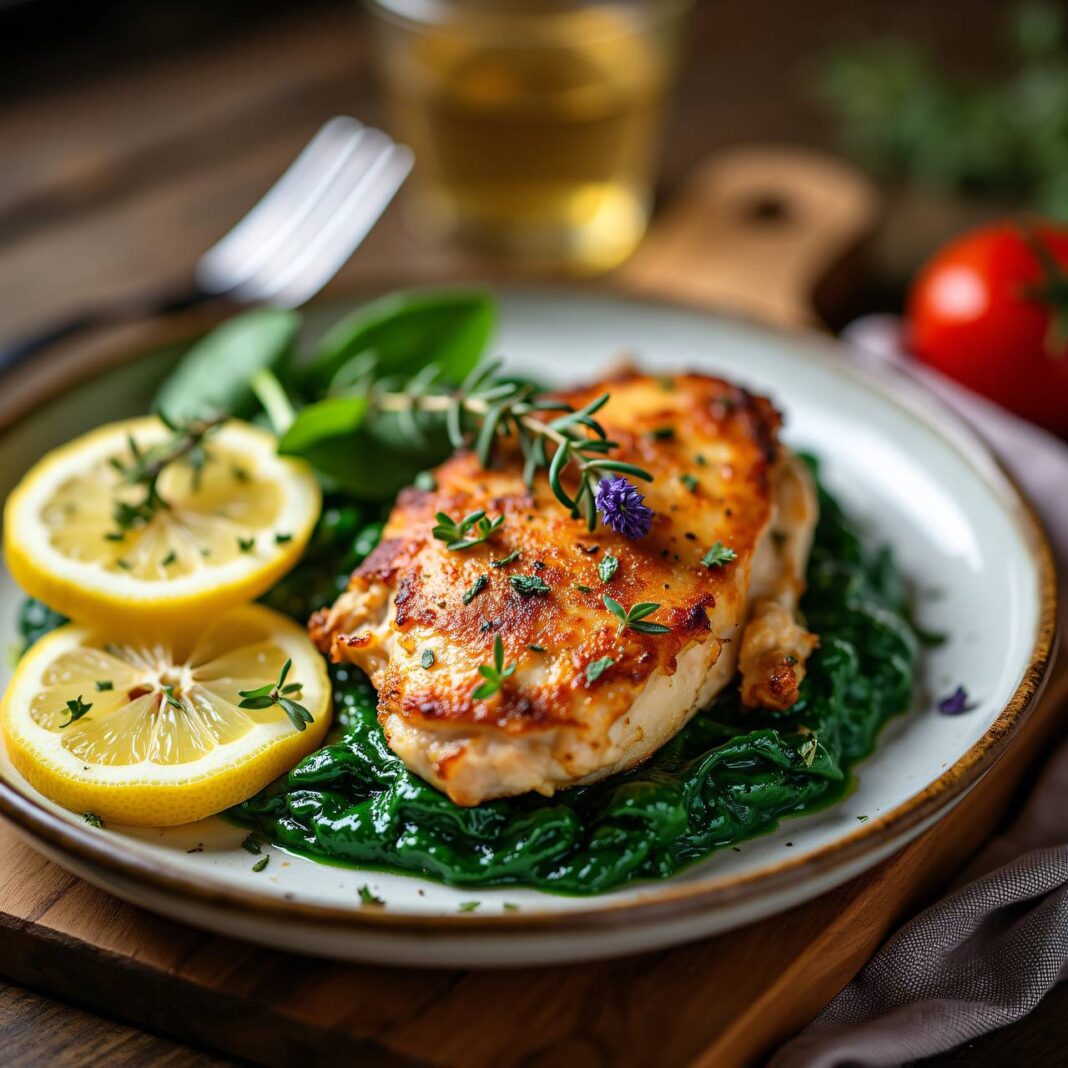 Ein köstliches Rezept für zarte Hühnerschenkel, mariniert mit Lavendel und serviert auf einem Bett aus cremigem Rahmspinat.