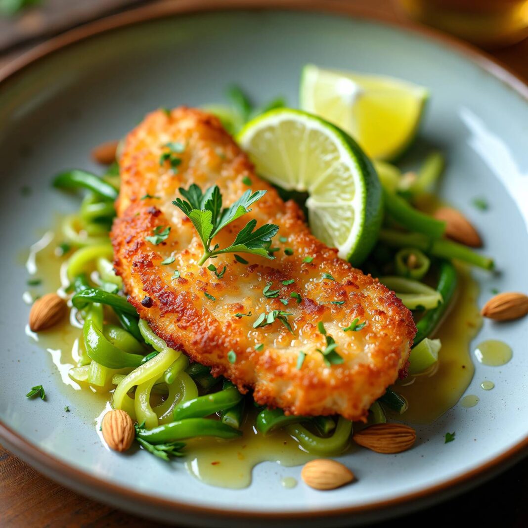 Ein köstliches Rezept für zarte Kalbsschnitzel, serviert mit aromatischem Stangensellerie und gerösteten Mandelblättchen.