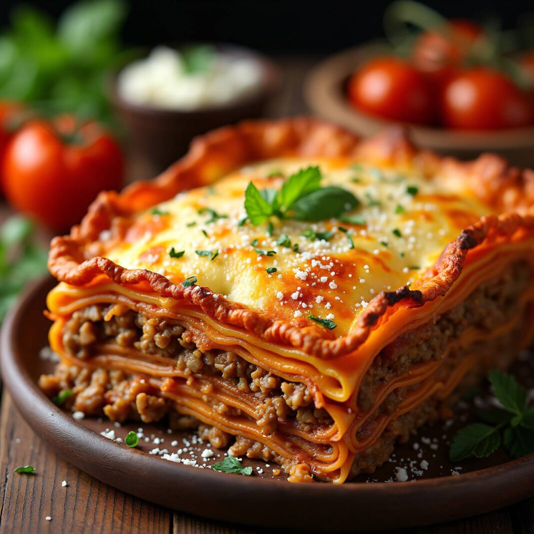 Eine köstliche und gesunde vegetarische Lasagne mit Linsen, Bolognese und Béchamelsauce.