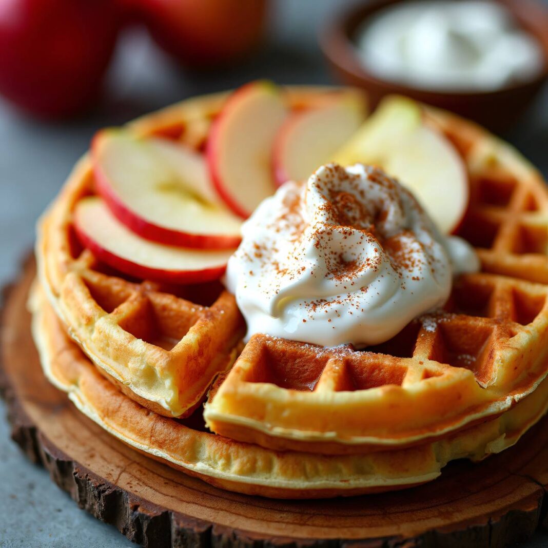 - Garnieren und Servieren: Die Waffeln mit dem zusätzlichen Topfen, Apfelspalten und etwas Zimt garnieren. Frisch genießen.