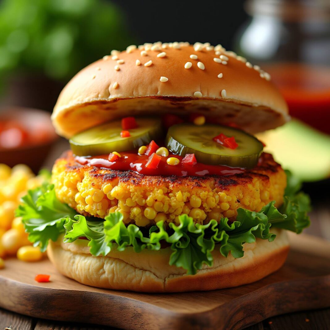 Ein leckerer und einfacher Veggie-Burger aus frischen Maiskörnern, serviert mit einem pikanten Ketchup.