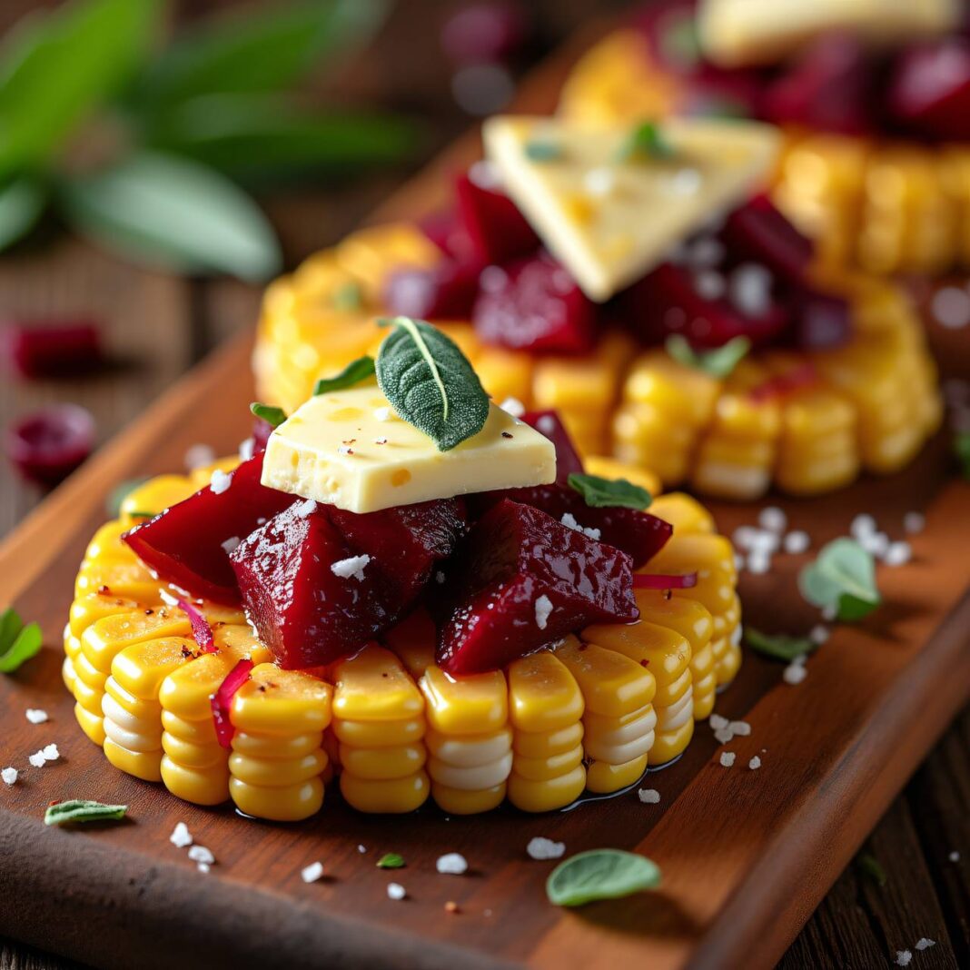 Ein köstliches Rezept für Maisschnitten, belegt mit Brie und serviert mit gebratenen roten Rüben.