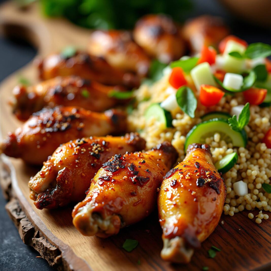 Anrichten: Servieren Sie die Hühnerflügel zusammen mit dem Couscoussalat.
