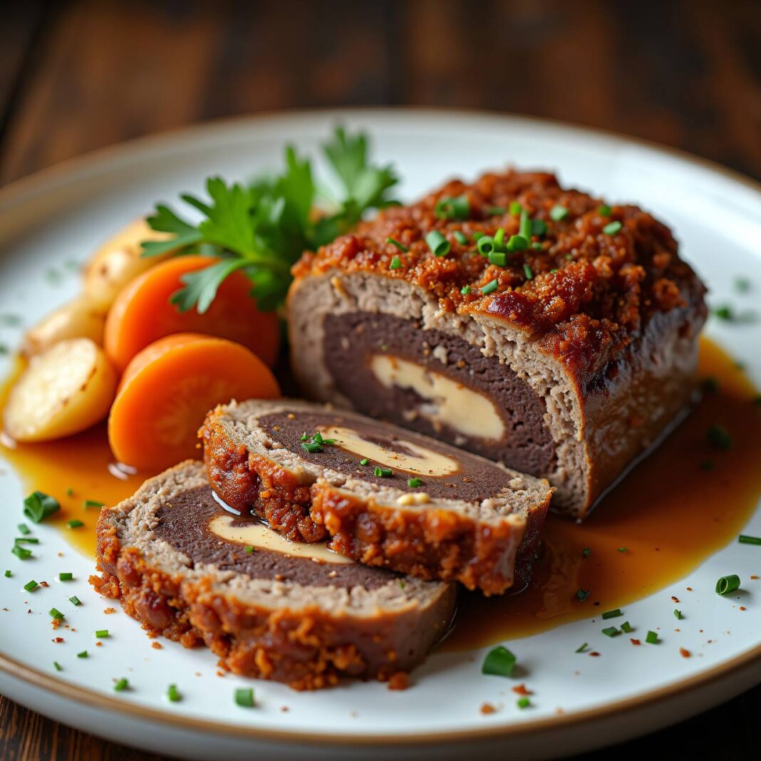 Ein köstlicher marmorierter Hackbraten, der mit einer cremigen Sauce serviert wird.