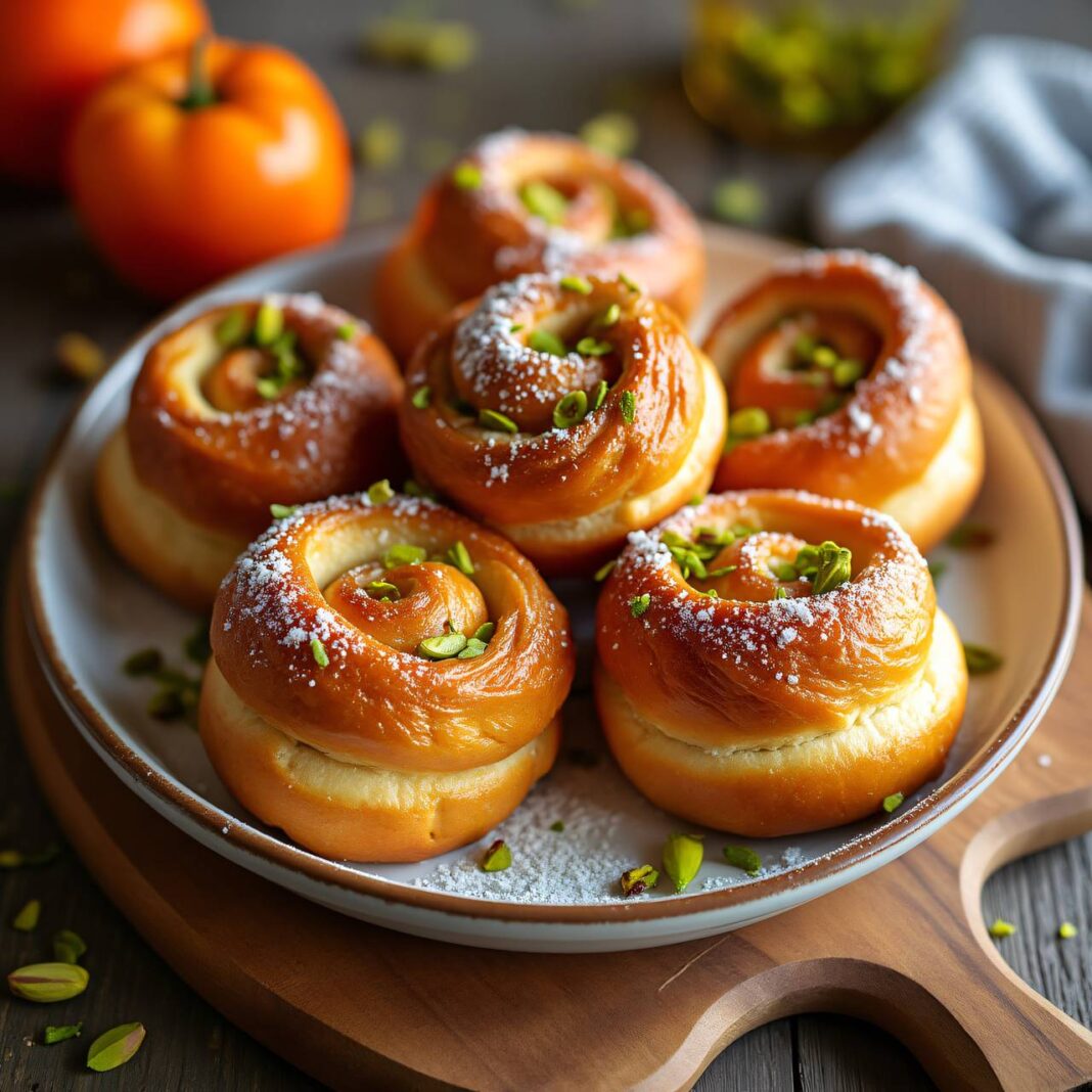 Leckere Hefeschnecken gefüllt mit Maronipüree und Mascarpone, glasiert mit Puderzucker und Pistazien.