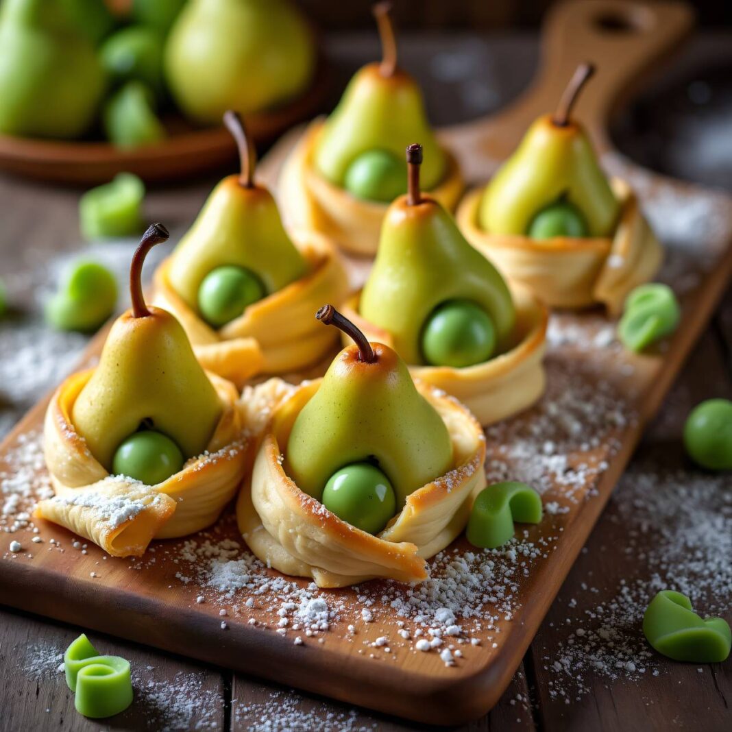 Ein köstliches Dessert aus gefüllten Birnen, umhüllt von Kuchenteig und verfeinert mit Marzipan.