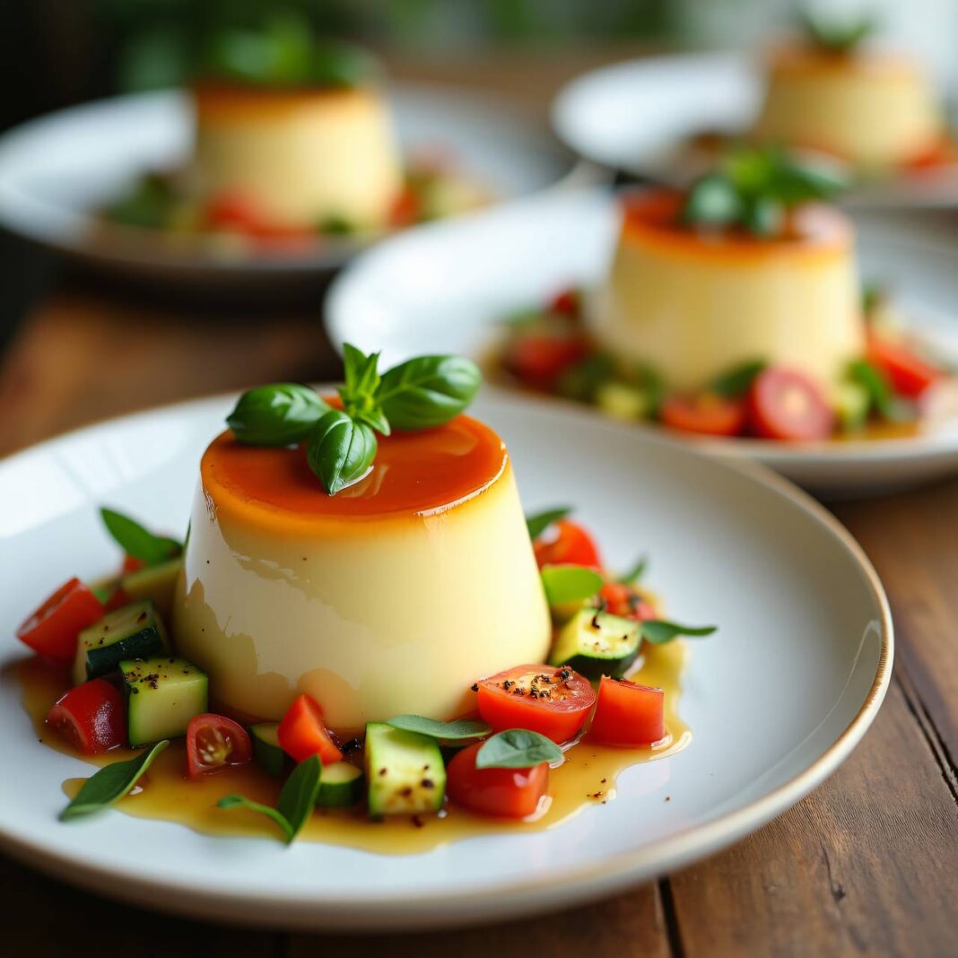 - Forme aus dem Sommergemüsetatar mit zwei Teelöffeln kleine Klösschen und richte sie neben den Flans an.