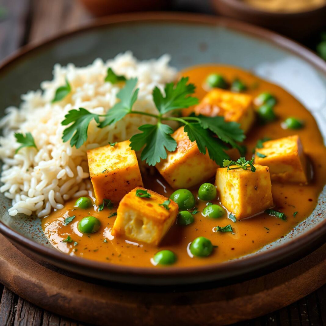 Ein köstliches indisches Gericht mit Erbsen und Paneer in einer gewürzten Sauce, serviert mit Basmati-Reis.