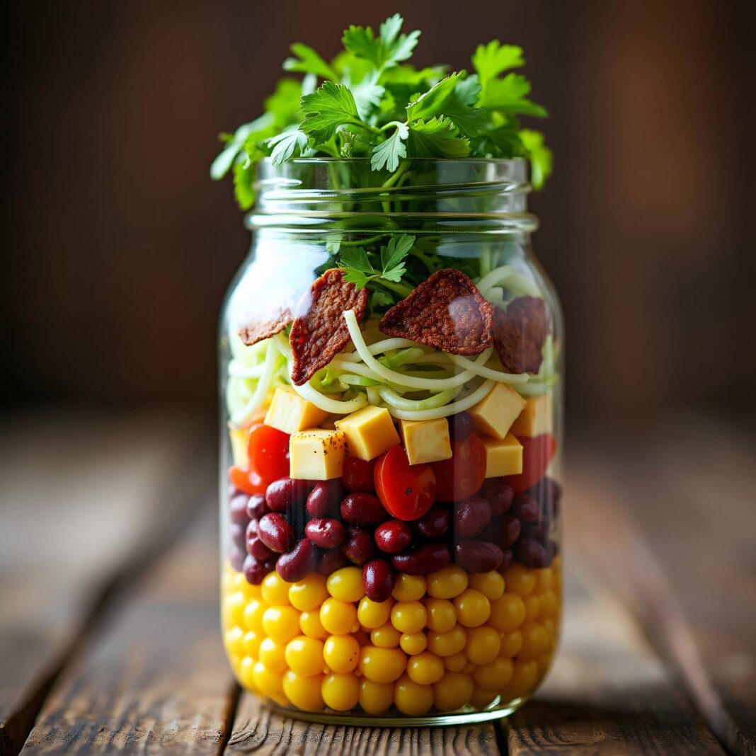 Ein erfrischender mexikanischer Salat, geschichtet im Glas, ideal für einen schnellen Snack oder eine leichte Mahlzeit.