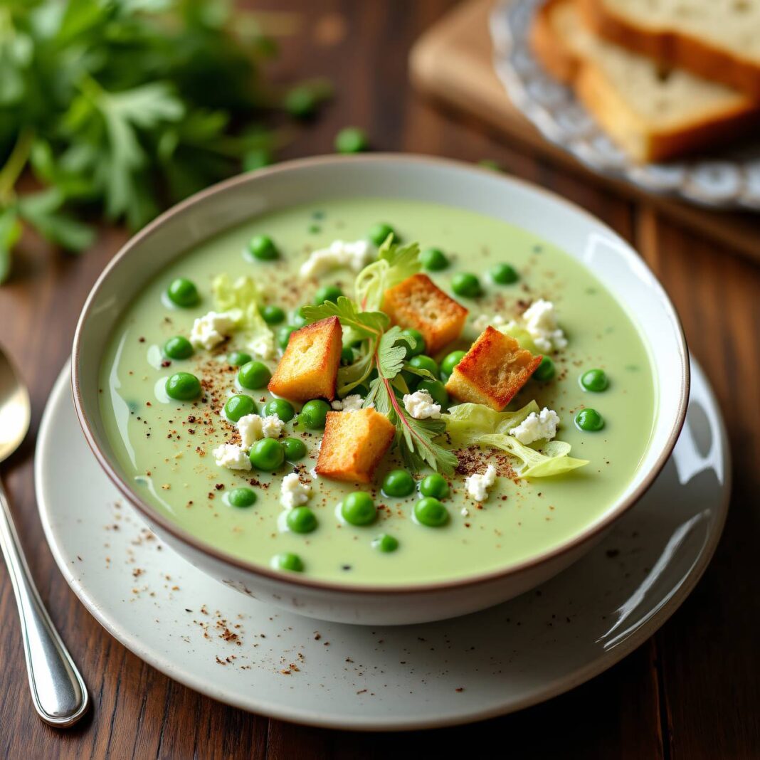 Eine cremige und nahrhafte Milch-Gemüse-Suppe mit frischen Erbsen, Zuckerschoten und knusprigen Croûtons.