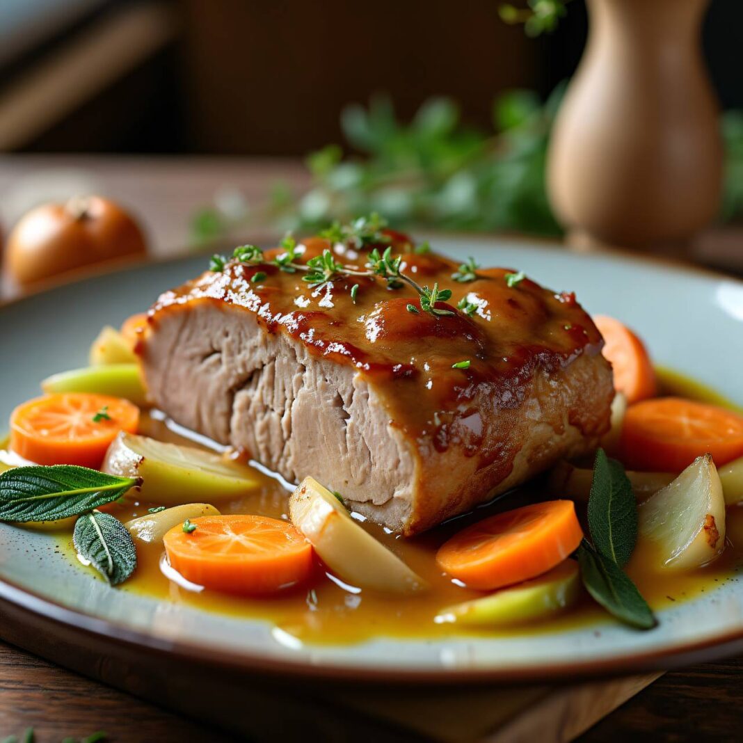 Ein saftiger Schweinsbraten in einer aromatischen Milch-Senf-Marinade, serviert mit Gemüse und einer cremigen Sauce.