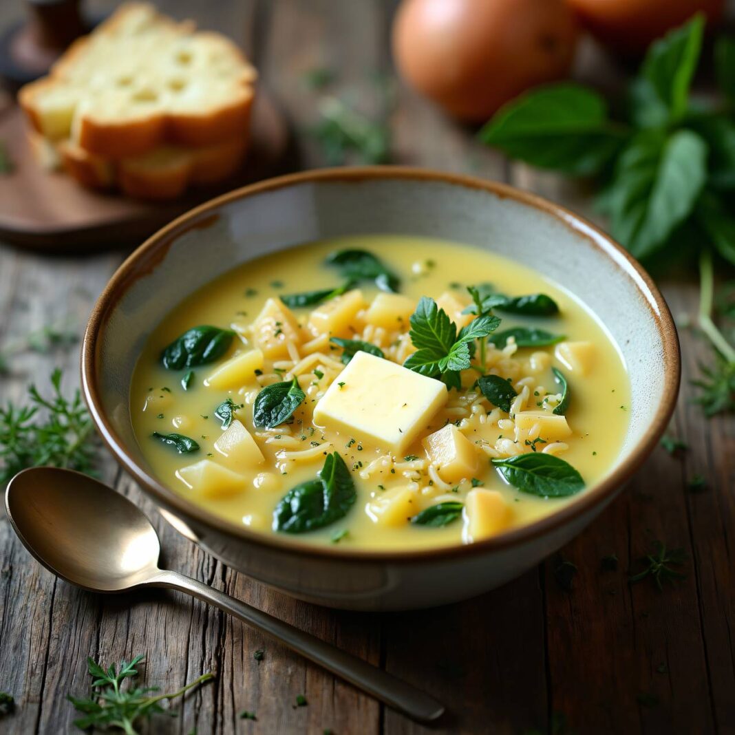 Eine köstliche und nahrhafte Milchsuppe mit Reis, Nudeln und frischen Brennnesselblättern oder Spinat.