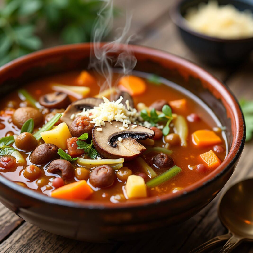 Eine leckere und herzhafte Minestrone mit Steinpilzen, Speck und Kichererbsen.