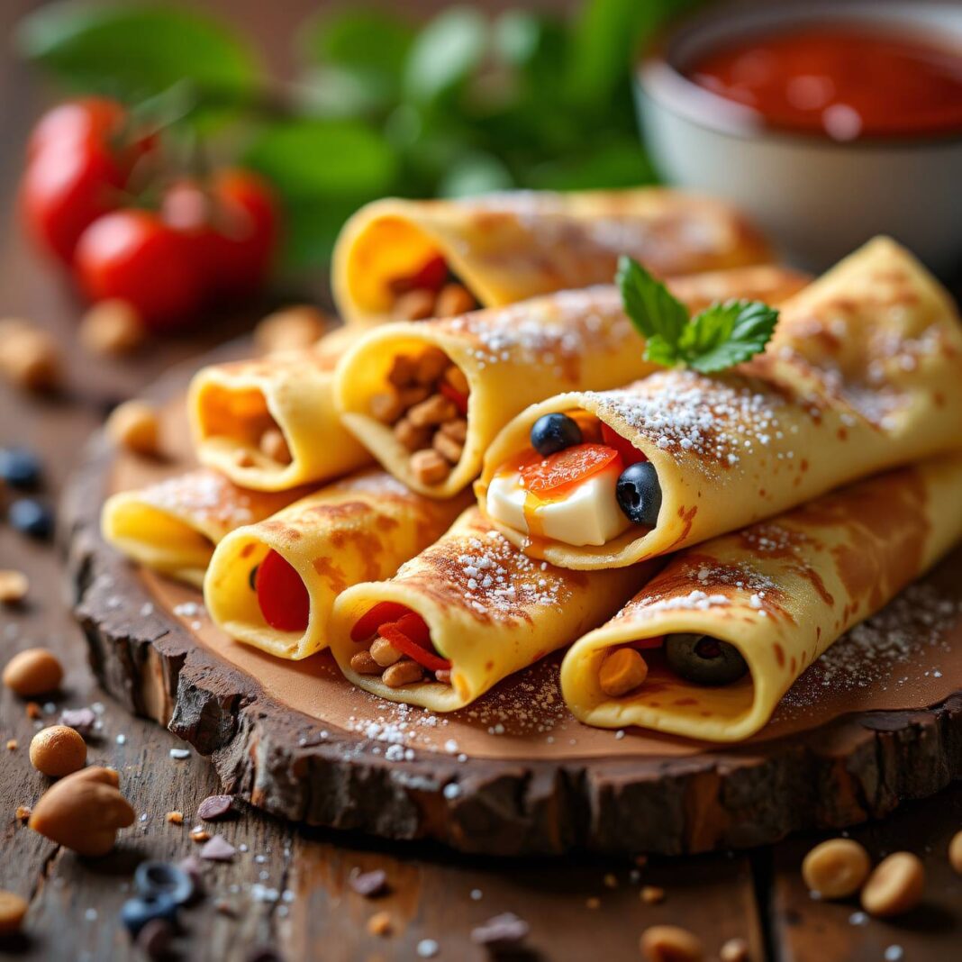 Leckere Mini-Crêpes, ideal für den Kindergeburtstag, mit verschiedenen süßen und pikanten Füllungen.