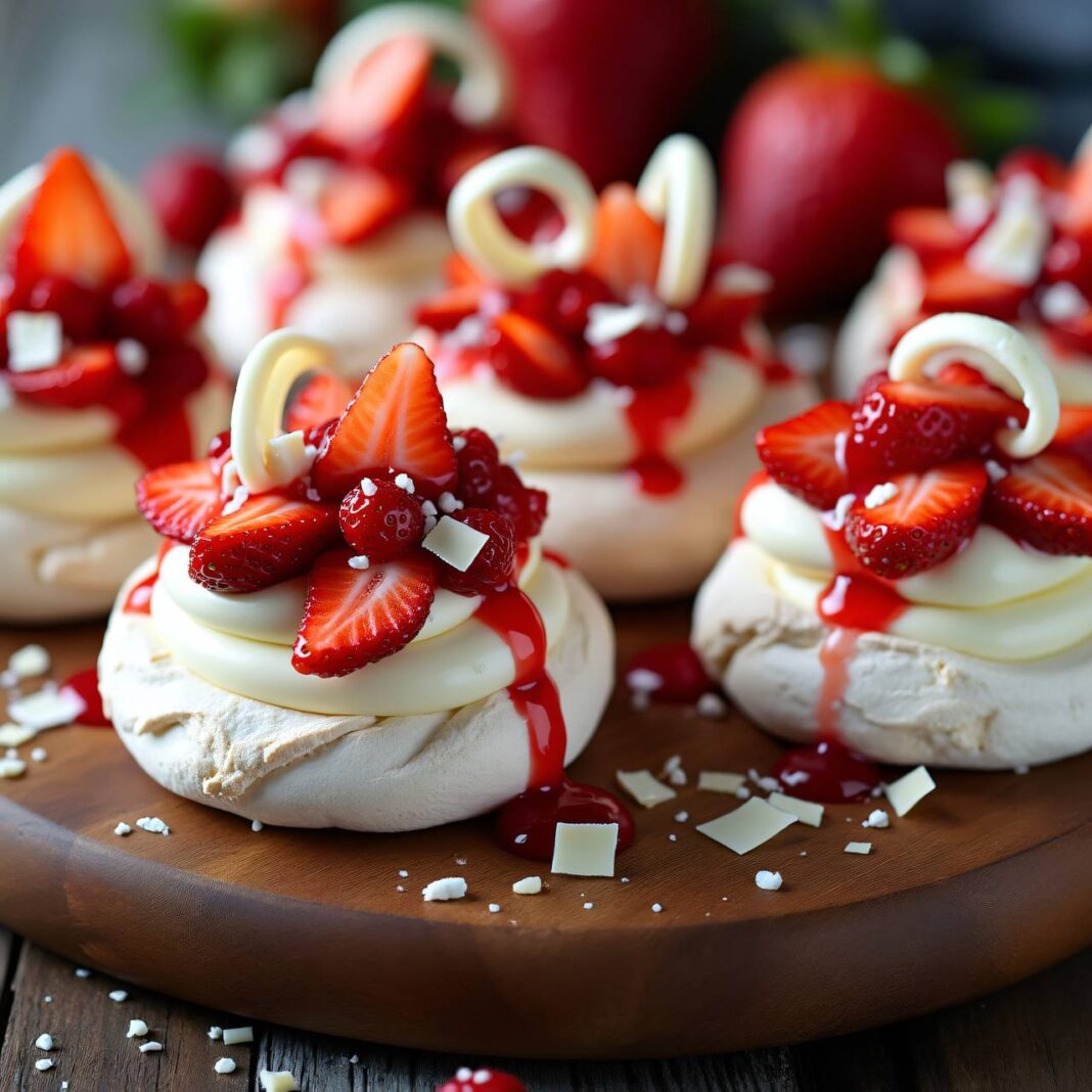 Leckere Mini-Pavlovas, gefüllt mit einer Quarkcreme und frischen Erdbeeren, perfekt für jede Gelegenheit.