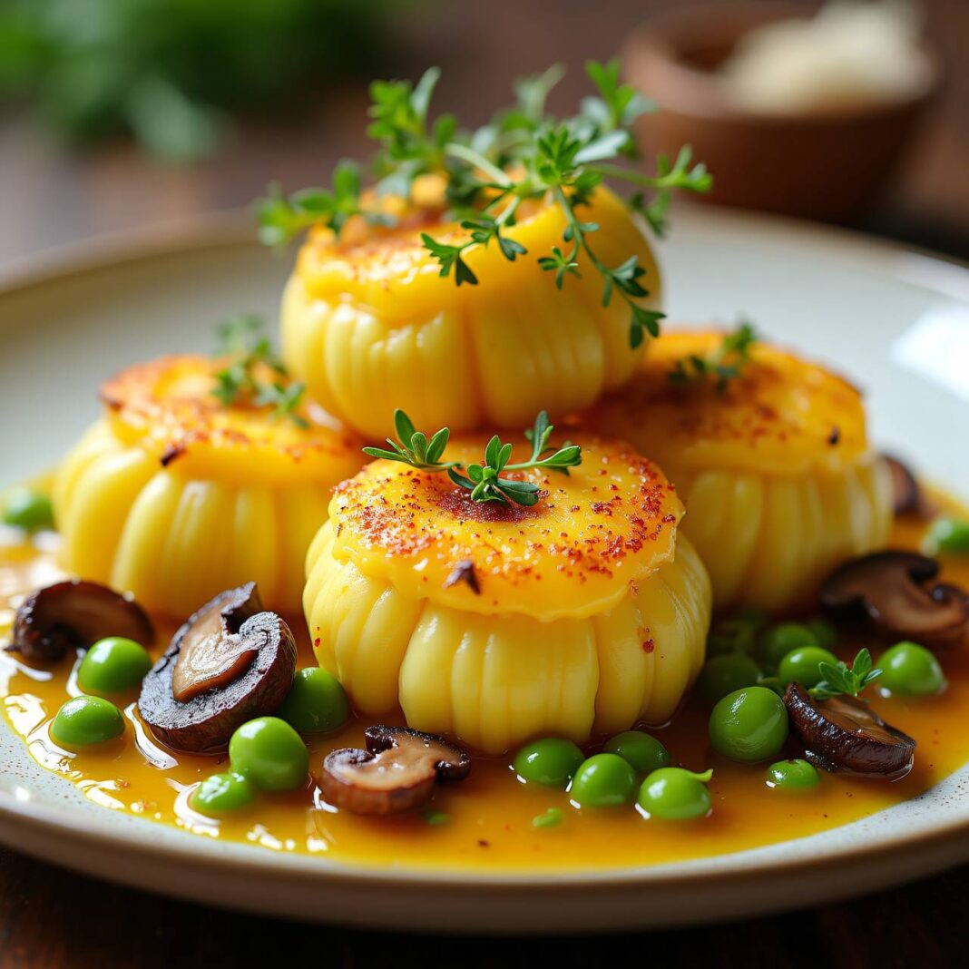 Ein köstliches Gericht aus gefüllten Rondini mit einem cremigen Safran-Kartoffelpüree, serviert mit einem aromatischen Erbsen-Shiitake-Ragout.
