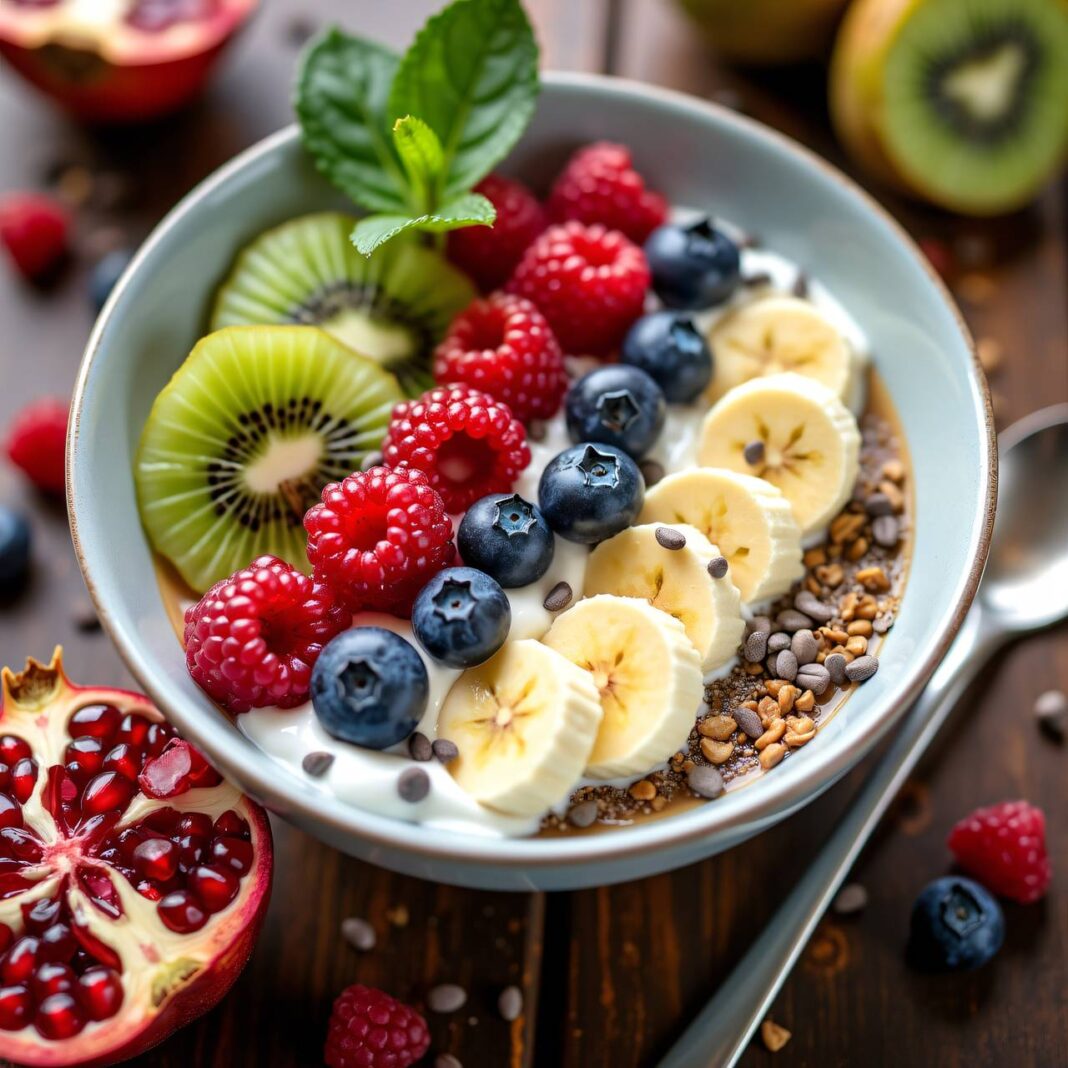 Ein gesundes und nahrhaftes Müsli mit frischen Früchten und proteinreichem Joghurt, ideal für ein energiereiches Frühstück.
