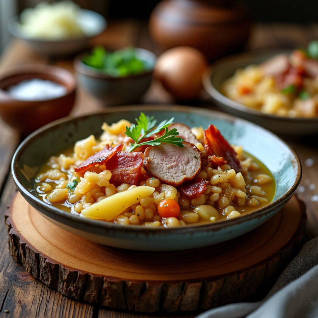 1. Schichte das Sauerkraut, die gehackte Zwiebel, das Schweinefleisch und den geräucherten Speck abwechselnd in einen großen Topf. Gib die Gerste darüber.