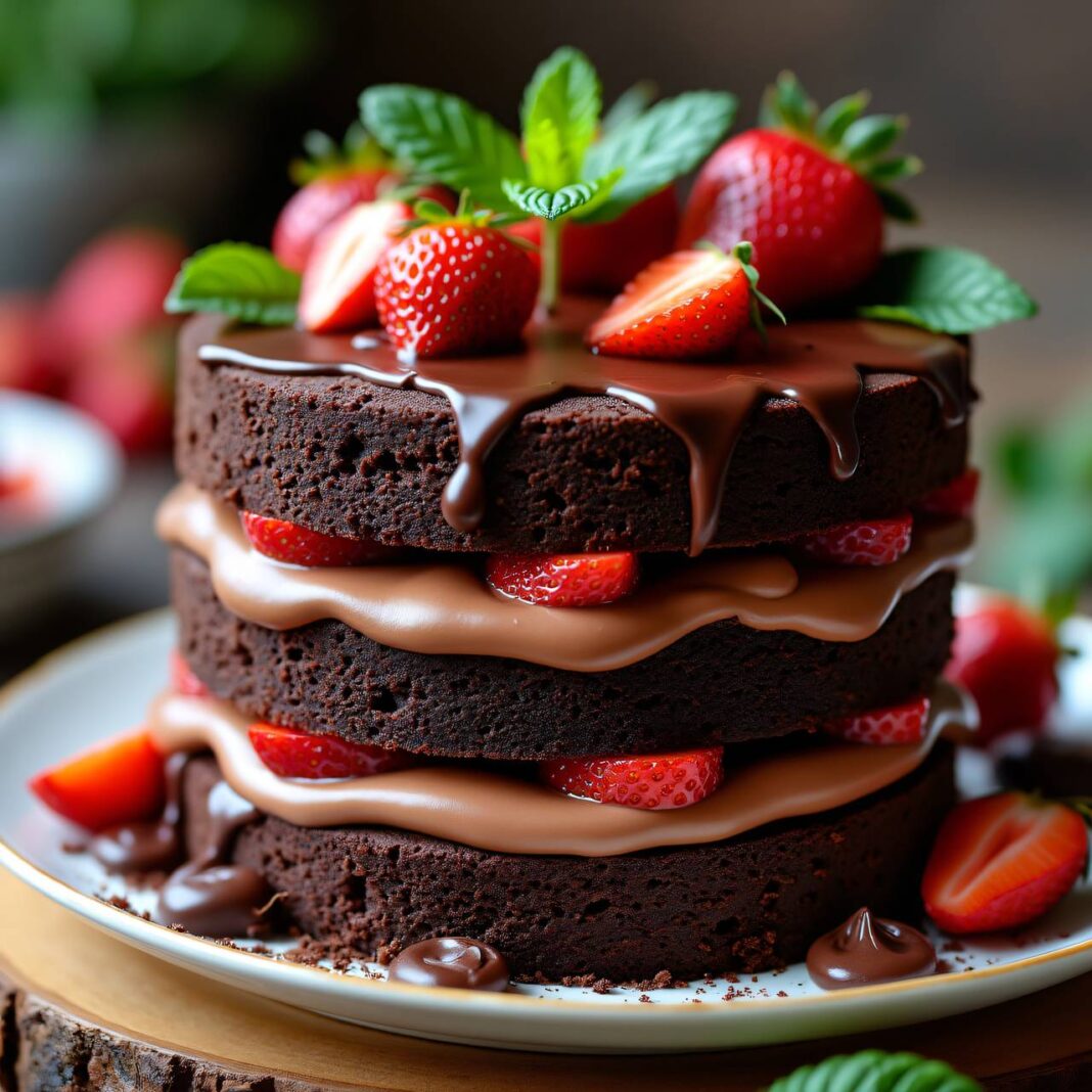 Ein luftiger Biskuitboden gefüllt mit einer cremigen Schokoladenfüllung und frischen Erdbeeren, perfekt für besondere Anlässe.