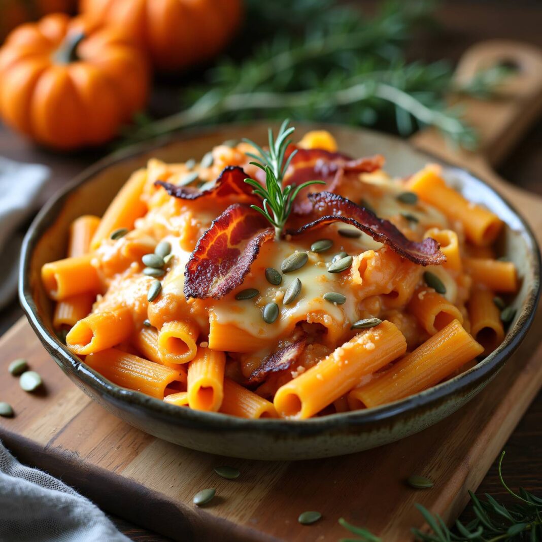 Ein köstliches Nudelgratin mit einer cremigen Karottensauce und herzhaftem Speck, ideal für ein herzhaftes Abendessen.