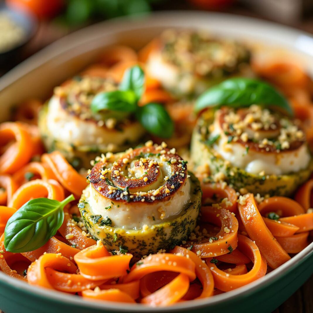 2. Kochen Sie die Nudeln in einem großen Topf mit siedendem Salzwasser al dente. Lassen Sie die Nudeln abtropfen und spülen Sie sie kurz mit kaltem Wasser ab. Mischen Sie die Nudeln mit den Karottenlocken und geben Sie diese Mischung in die vorbereitete Auflaufform. Legen Sie die Hühnerrollen darauf.
