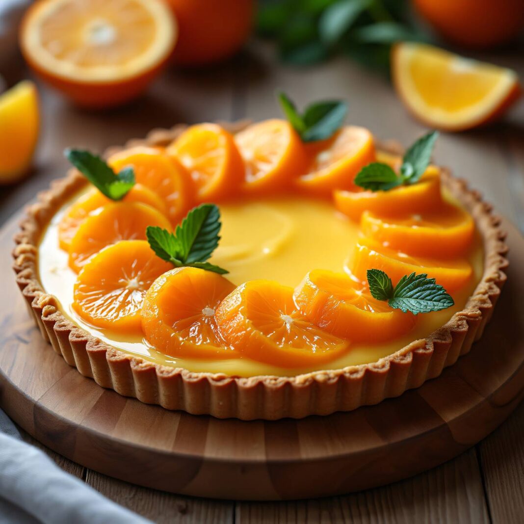 6. Lassen Sie die Tarte leicht auskühlen und garnieren Sie sie anschließend mit glasierten Orangenscheiben und frischer Pfefferminze.
