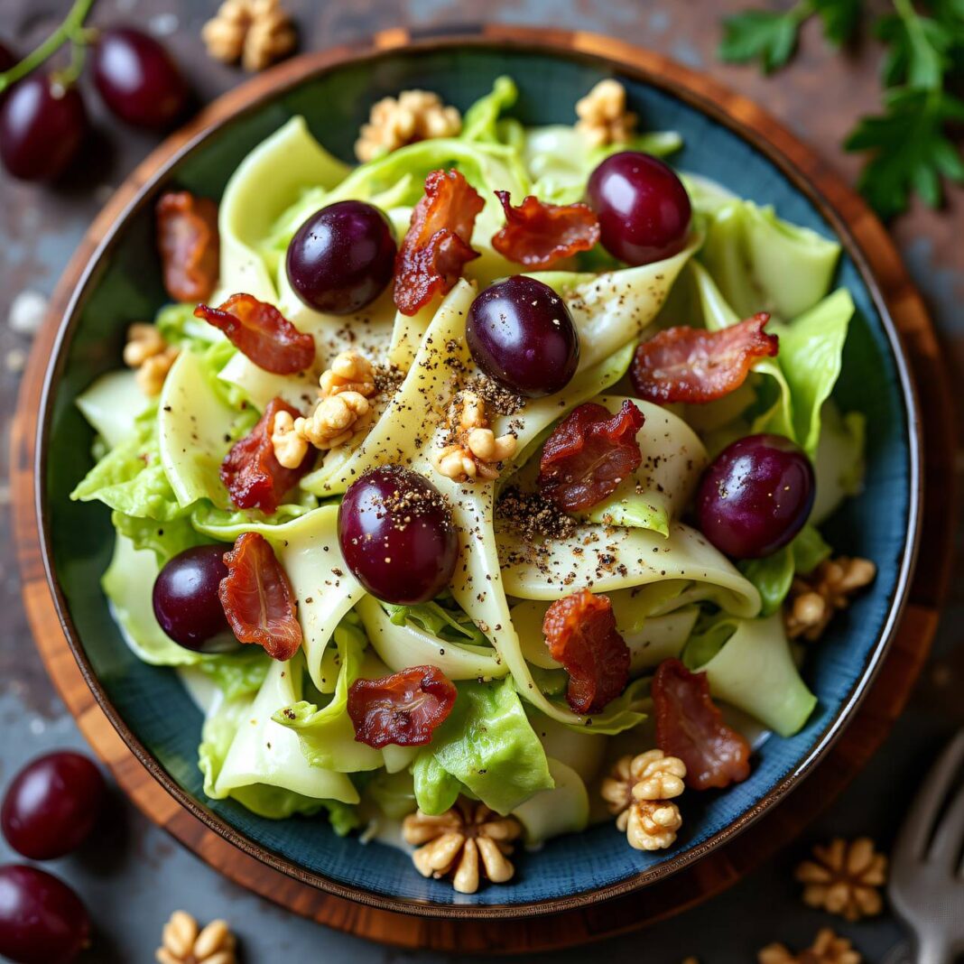 Ein köstliches Gericht aus Wirsing, Trauben und Baumnüssen, das warm als Beilage oder Hauptspeise serviert wird.